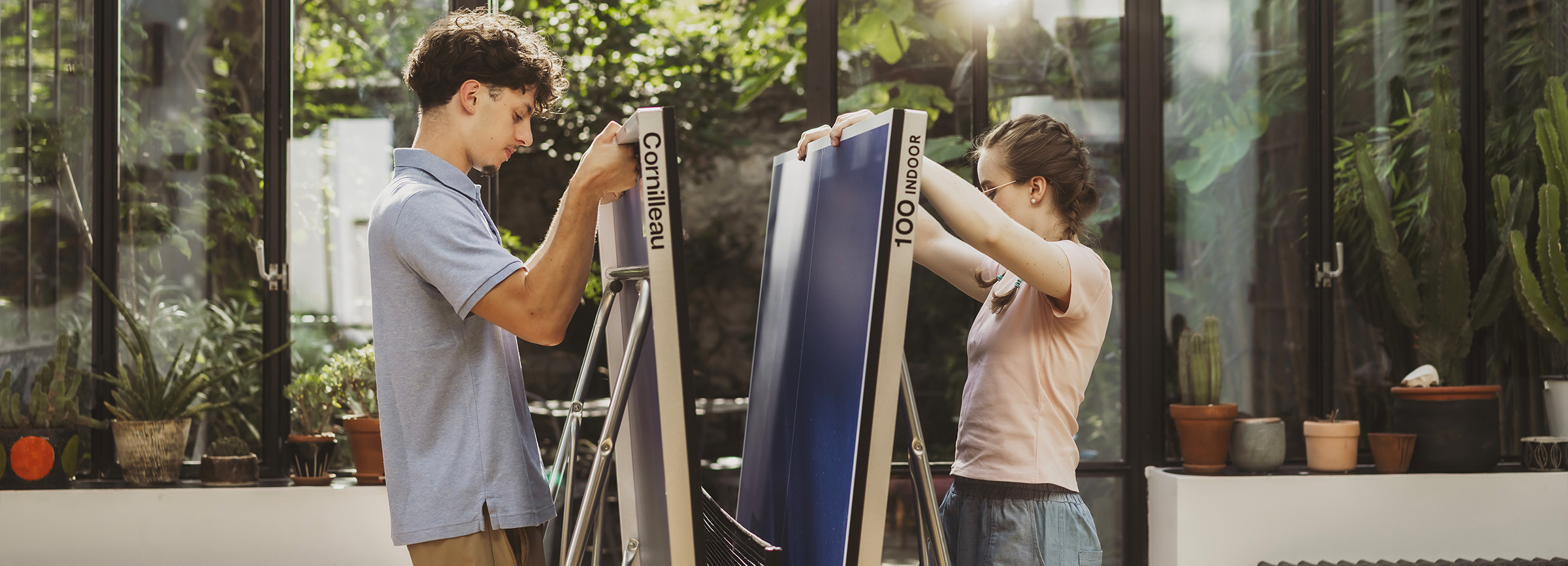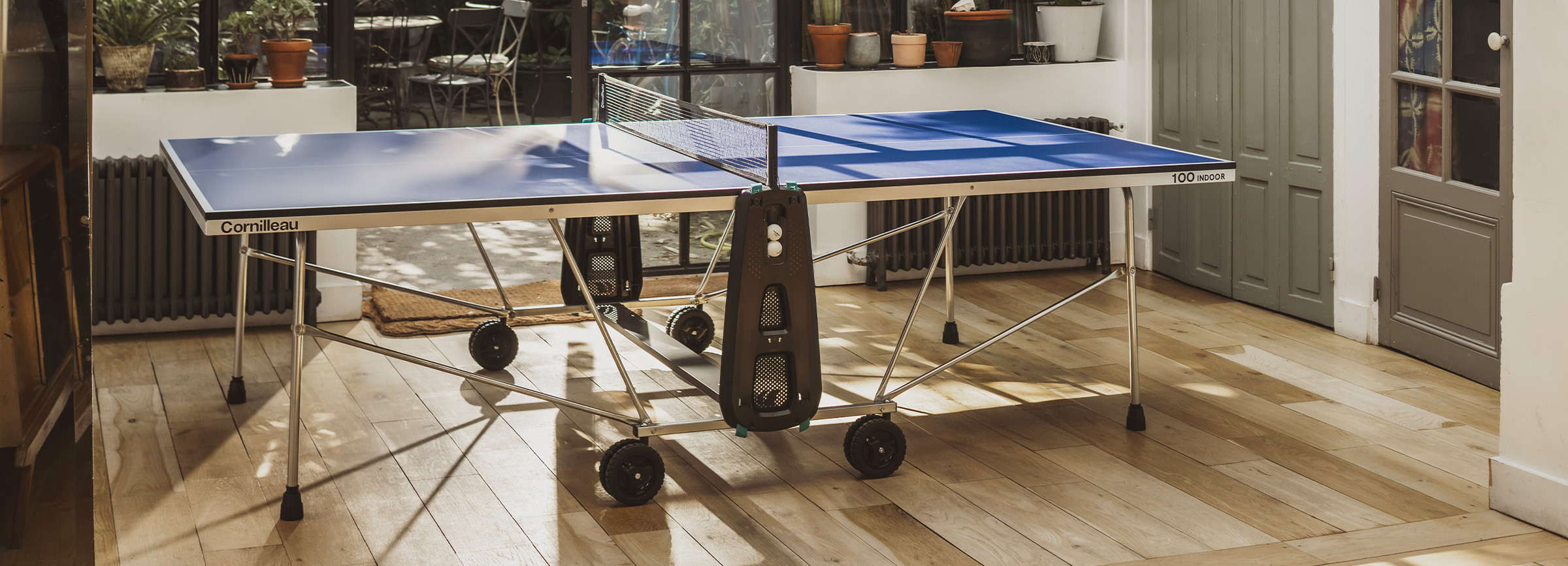 Stół 100 INDOOR marki Cornilleau to idealny sprzęt do użytku domowego. Posiada parametry pozwalające na komfortową i bezpieczną grę. Wyposażony został w regulowaną siatkę, podwójne koła oraz kieszenie na piłeczki.